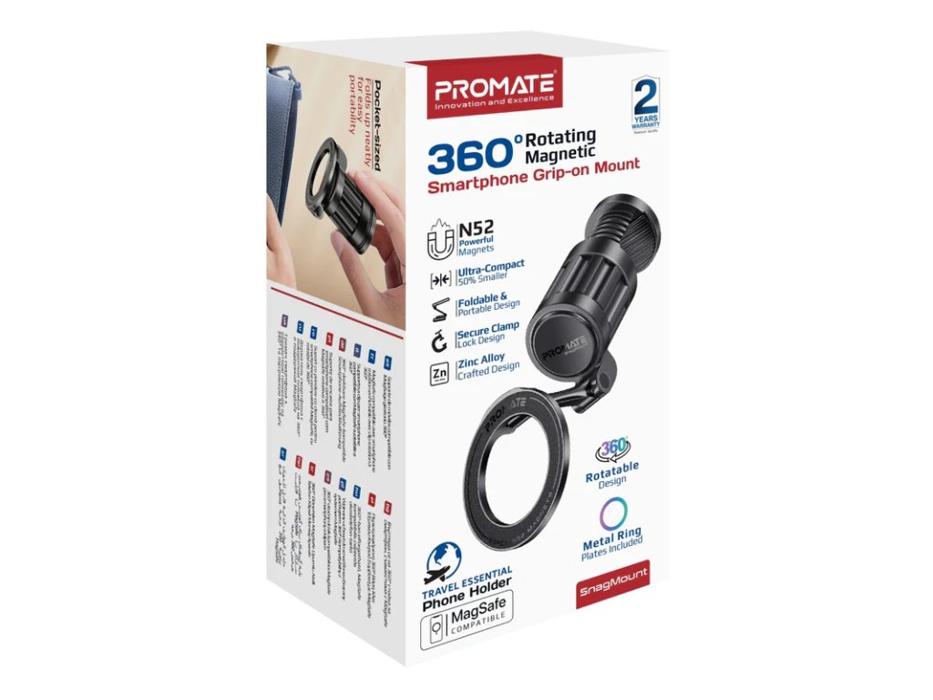 PROMATE SnagMount je univerzální magnetický držák na smartphone, který nabízí pevné uchycení, vysokou odolnost a maximální flexibilitu použití. Díky 20 silným magnetům N52 kompatibilním s MagSafe udrží telefon stabilně na místě doma, v autě i na cestách.