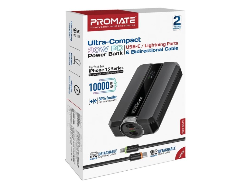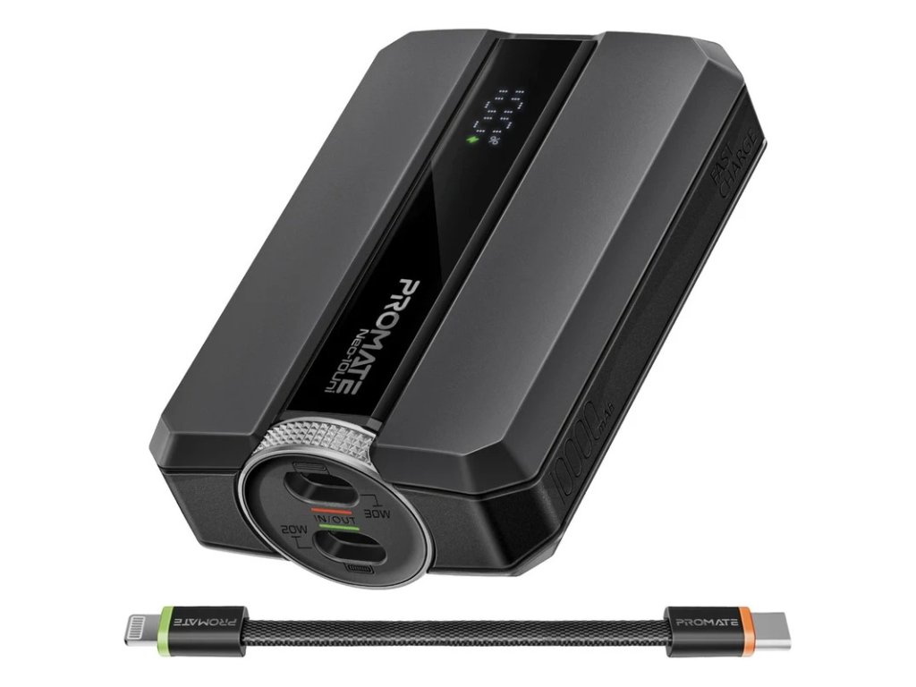 PROMATE Ultra-kompaktní PD powerbanka s USB-C / Lightning porty & obousměrným kabelem, 30 W, 10 000 mAh