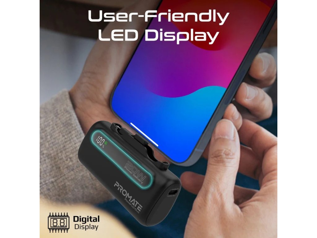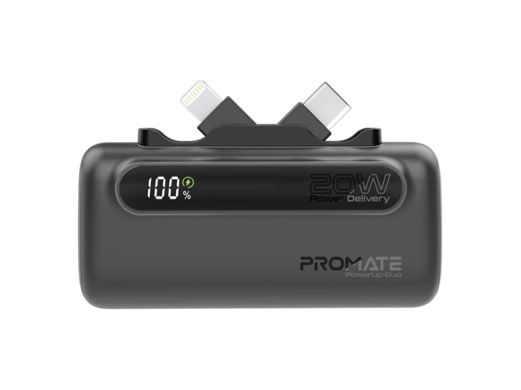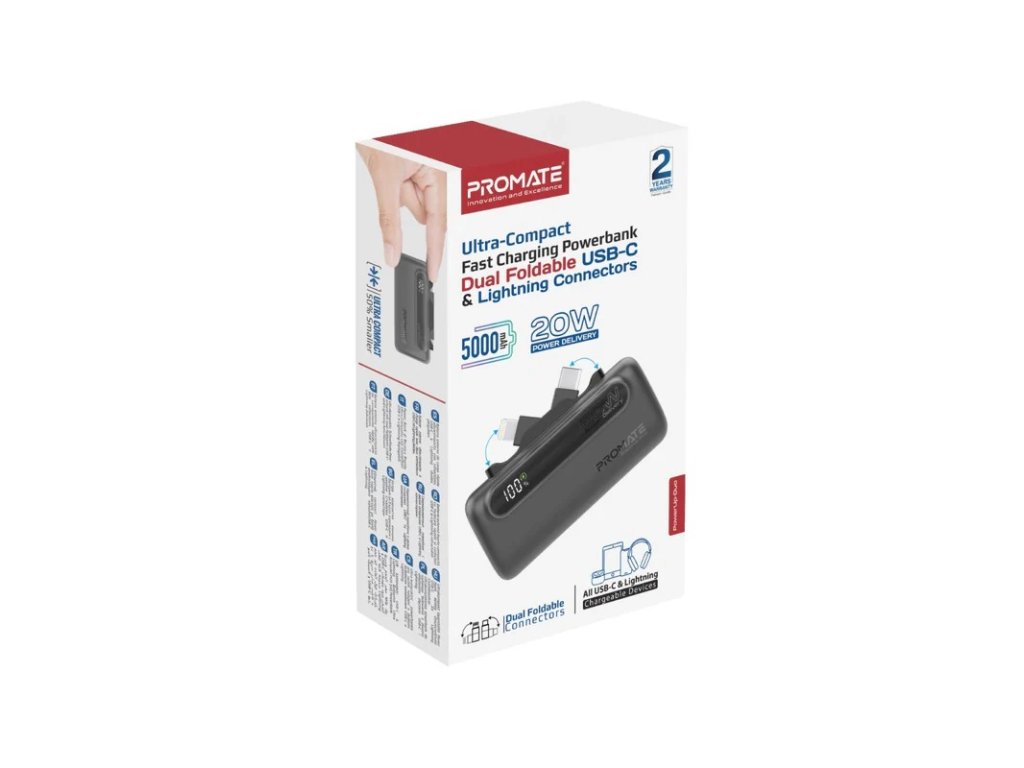 PROMATE Ultra-kompaktní powerbanka s rychlým nabíjením s dvojitými skládacími konektory USB-C™ a Lightning, 20 W, 5 000 mAh