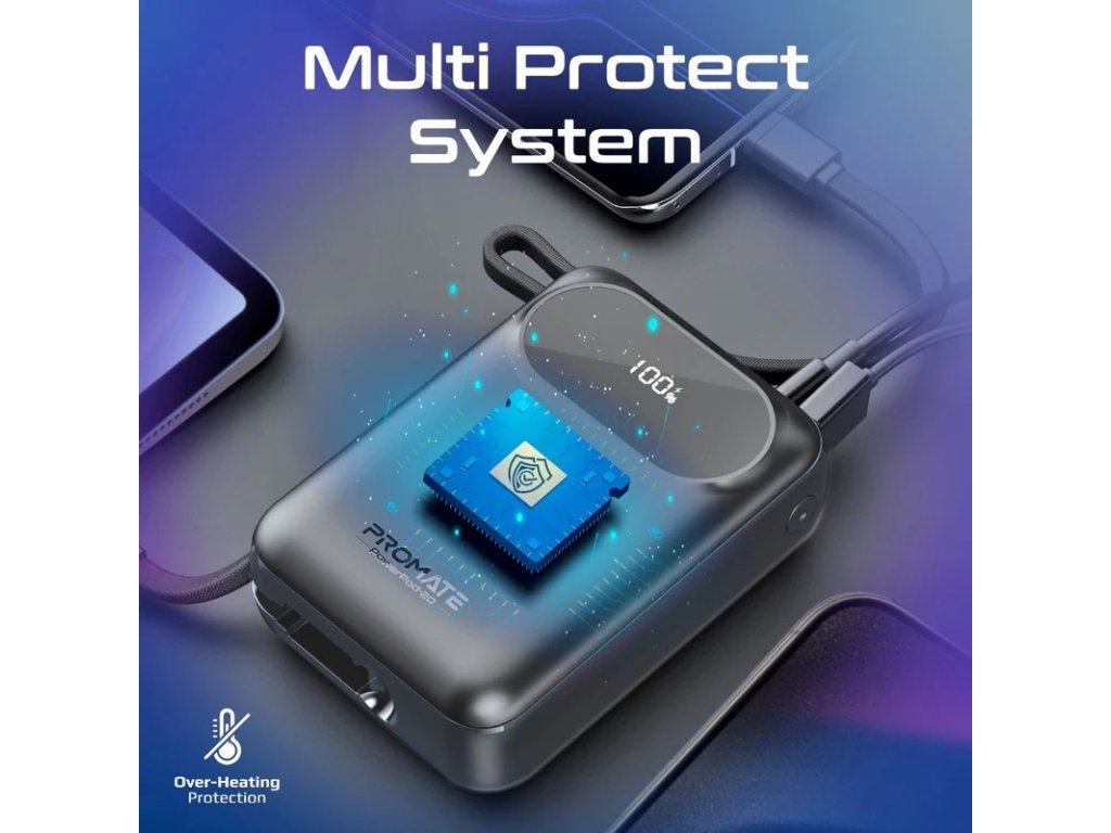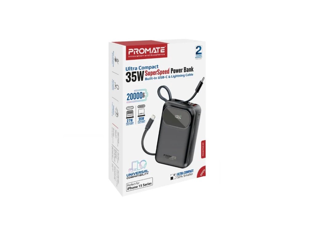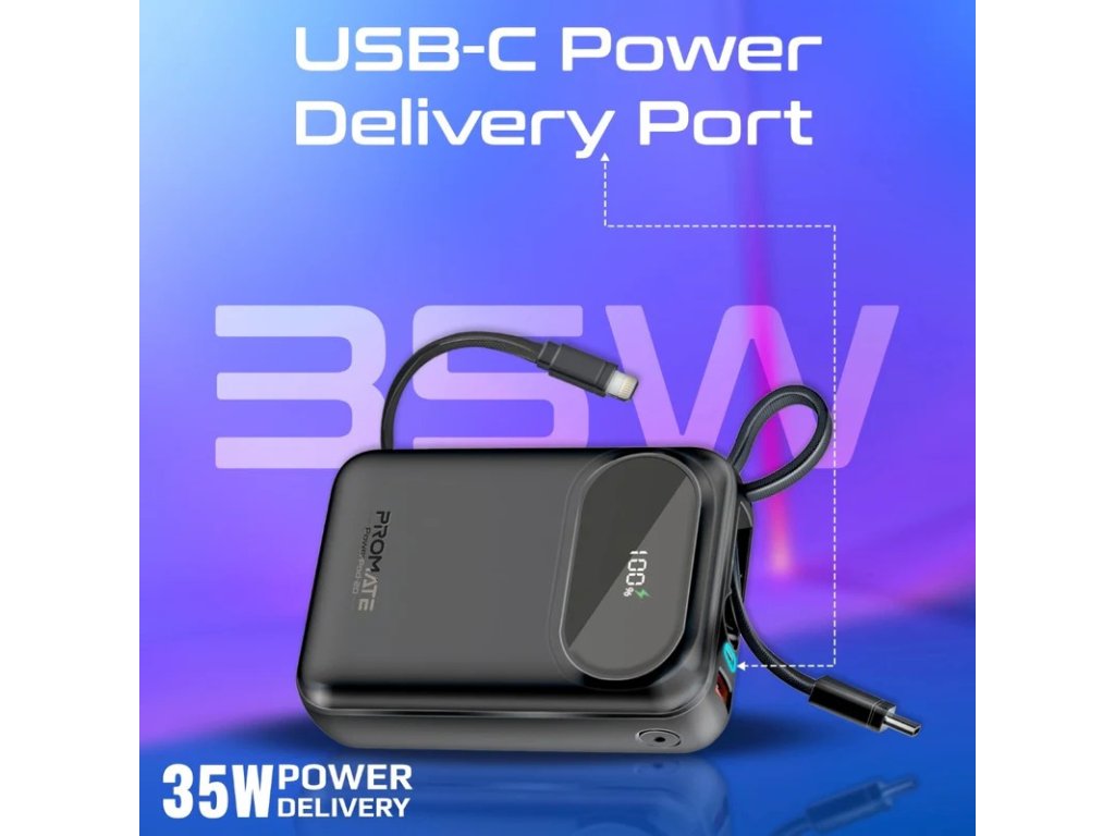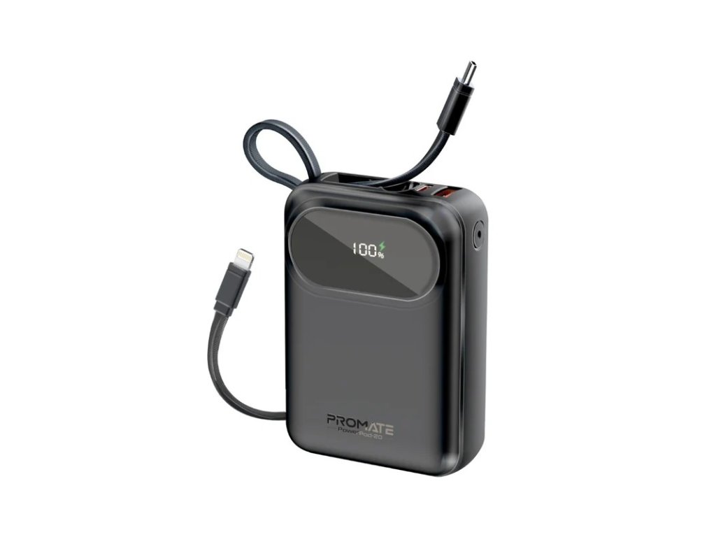 PROMATE Ultra kompaktní powerbanka SuperSpeed™ s vestavěným USB-C & Lightning kabelem, 35 W, 20 000 mAh