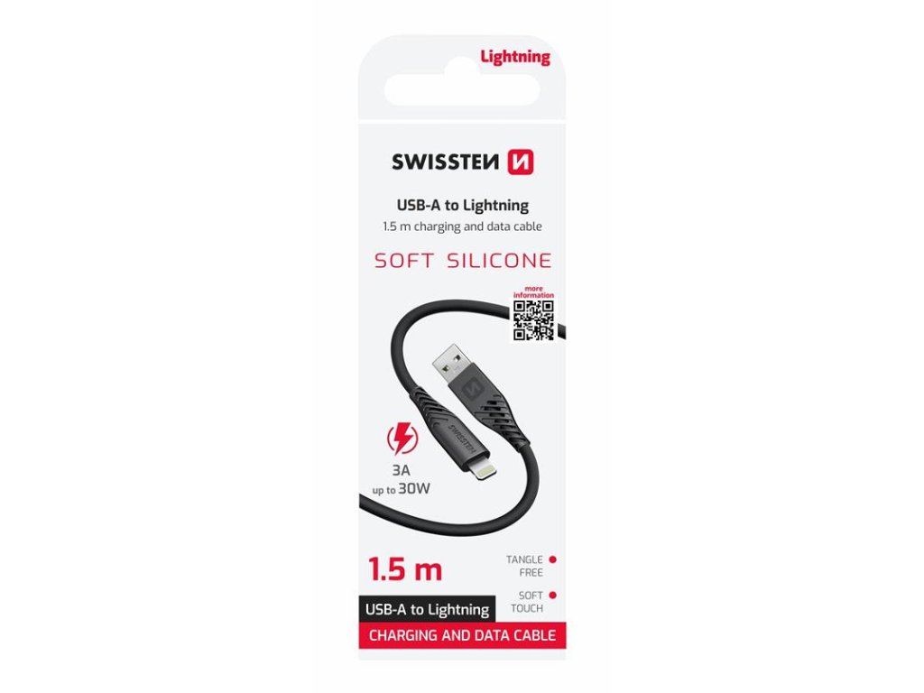 Datový kabel SWISSTEN SOFT SILICONE USB / lightning s délkou 1,5m a výkonem 30W a proudem až 3A. Baleno v blistru SWISSTEN.