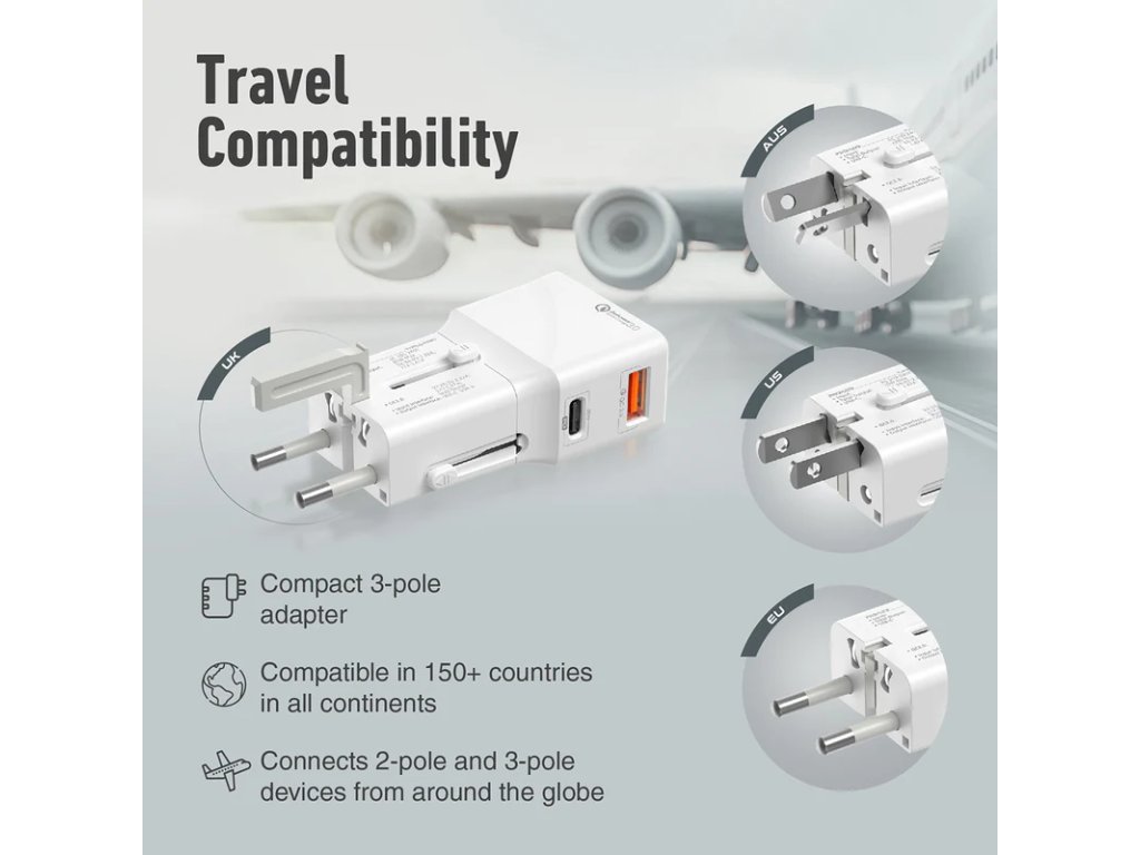 PROMATE TriPlug-PD20 je navržena pro cestování nalehko. Díky univerzální kompatibilitě se zásuvkami v Evropě, Velké Británii, USA, Austrálii i dalších regionech se na ni můžete spolehnout kdekoliv na světě. Kompaktní rozměry a výsuvný konektor umožňují snadné uložení do batohu či kufru bez zbytečného zabírání místa.