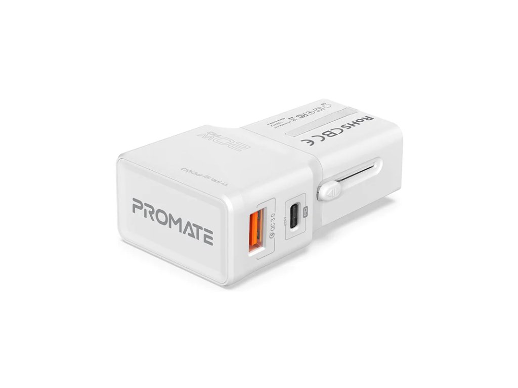 PROMATE TriPlug-PD20 univerzální cestovní nabíječka se zásuvkou a USB-C a USB-A, PD/QC, 20 W, bílá