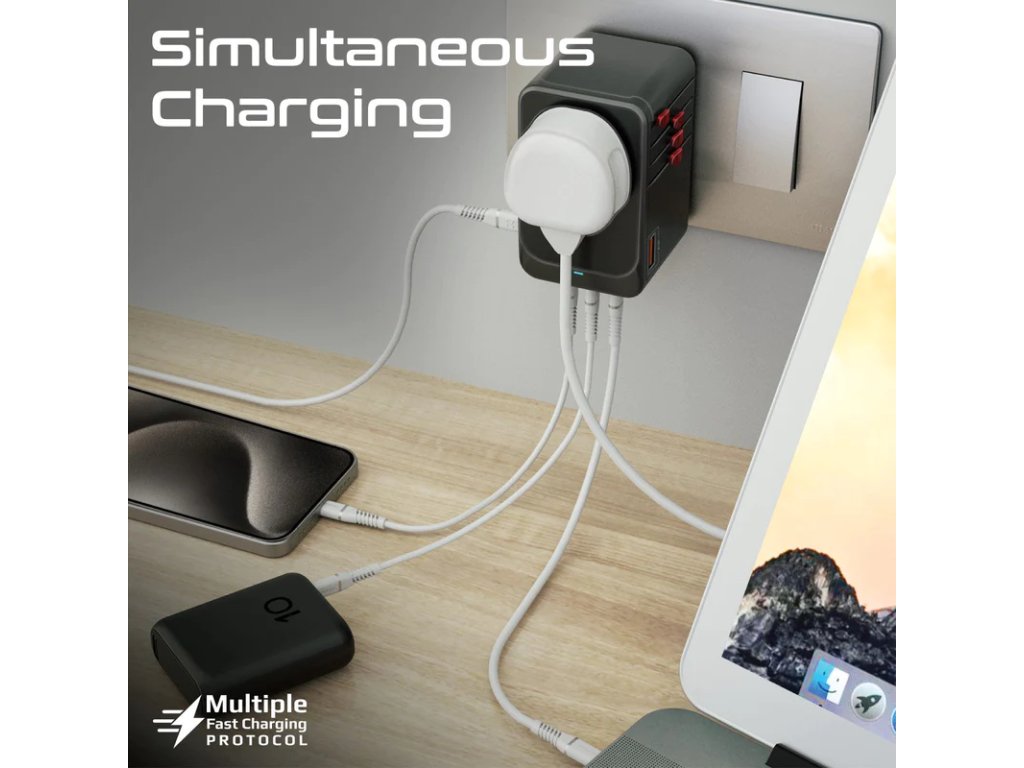 Nabíječka umožňuje připojit až 5 zařízení najednou prostřednictvím 4× USB-C, 1× USB-A a univerzální AC zásuvky. Podporuje Power Delivery až 100 W, takže bez problémů zvládne nabíjení notebooků, tabletů i telefonů. Je kompatibilní se zásuvkami ve více než 180 zemích světa a ideální pro cestování i pracovní nasazení.