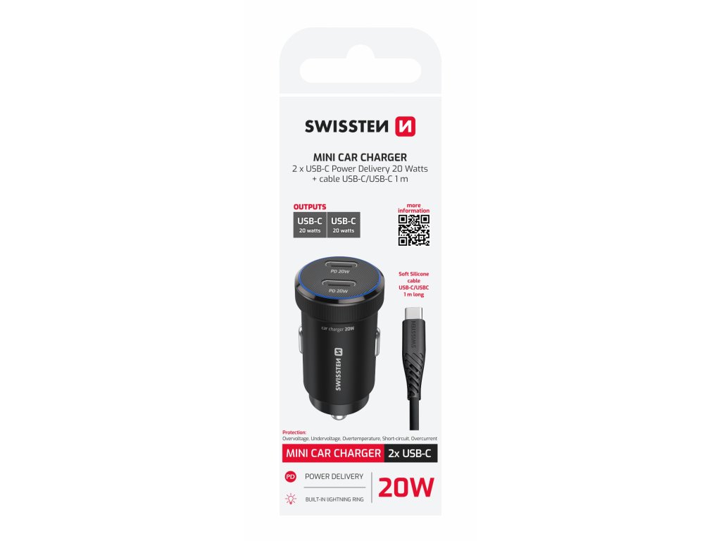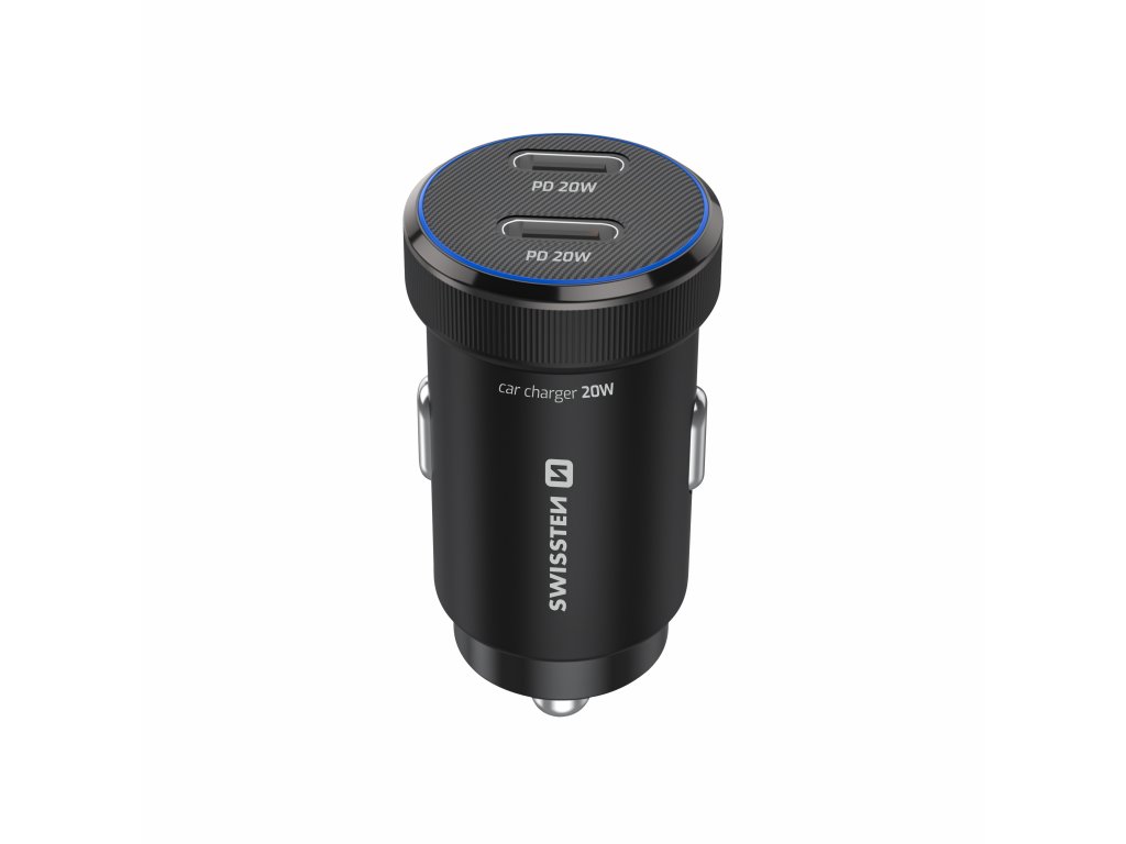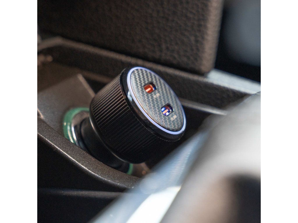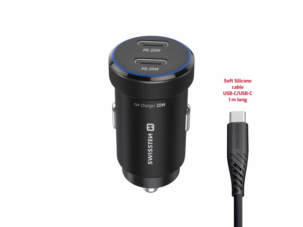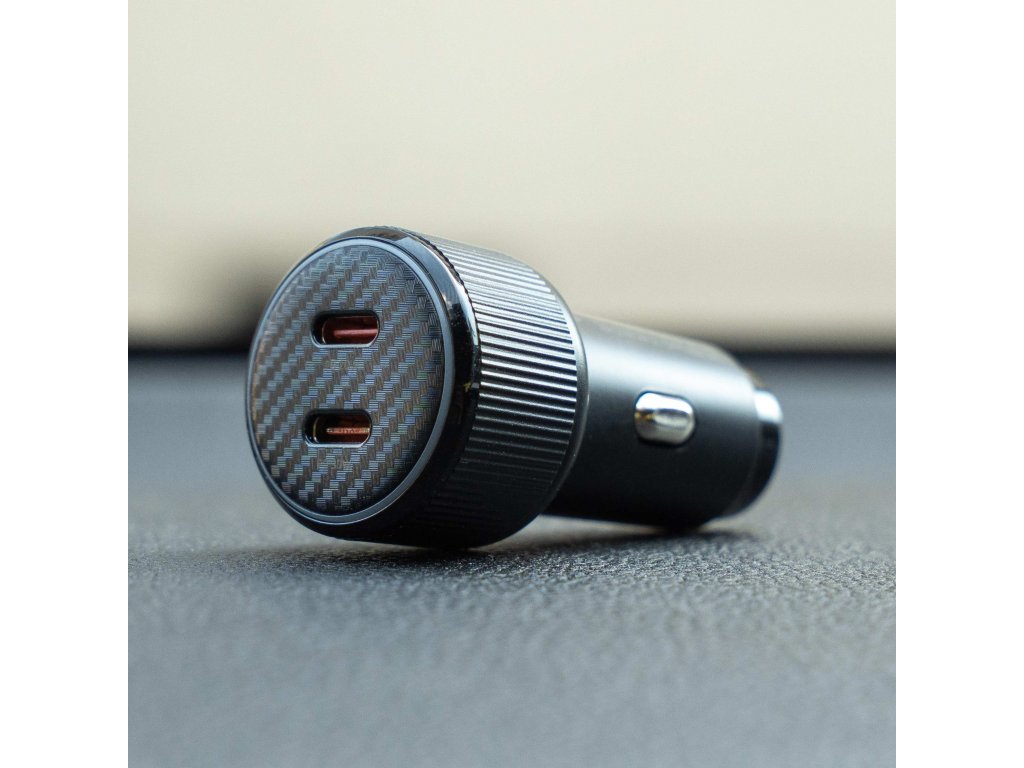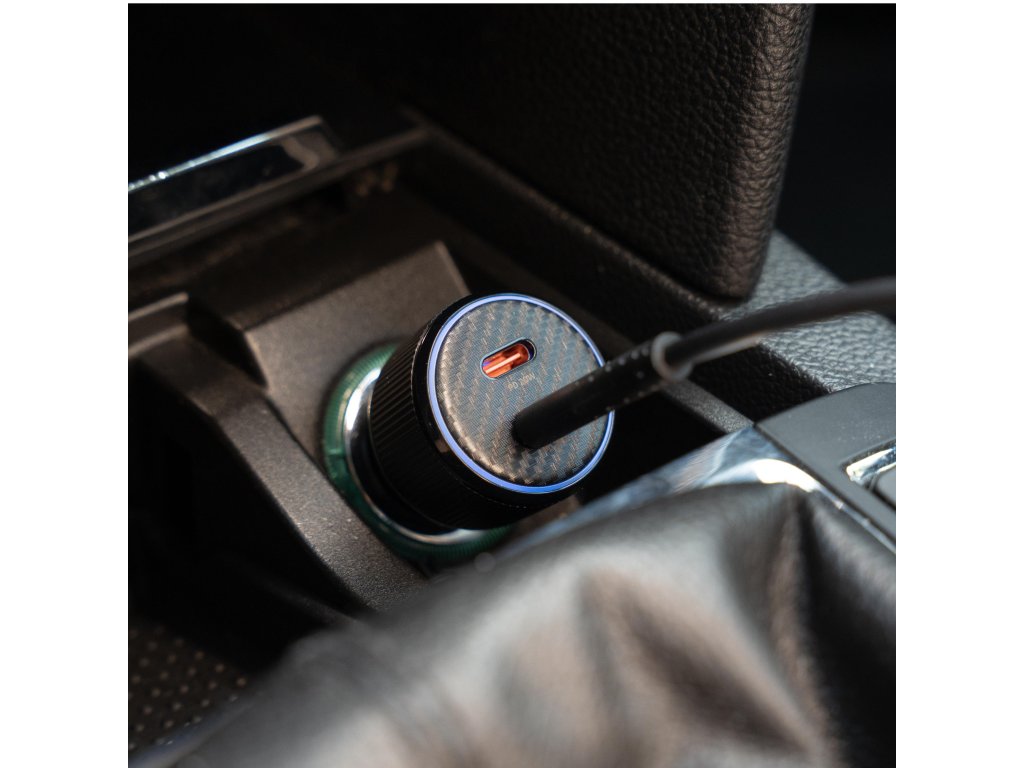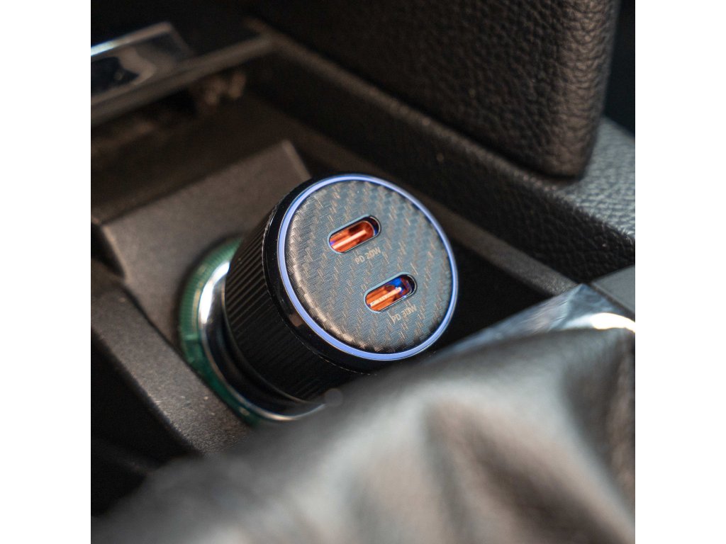 Praktická autonabíječka s dvojicí USB-C portů a podporou PD 3.0, dodávaná s prémiovým USB-C/USB-C kabelem (1 m, 60W, 3A, soft silicone). Modré LED podsvícení usnadňuje připojení i ve tmě.