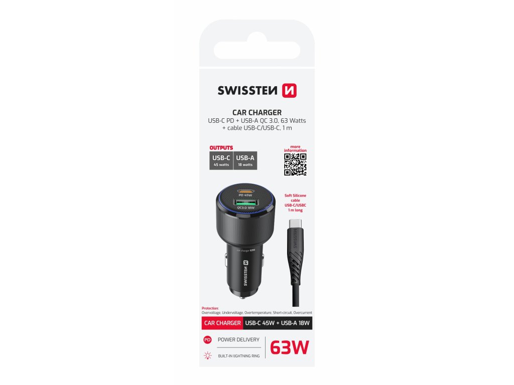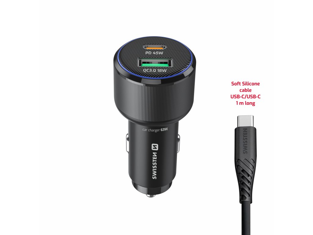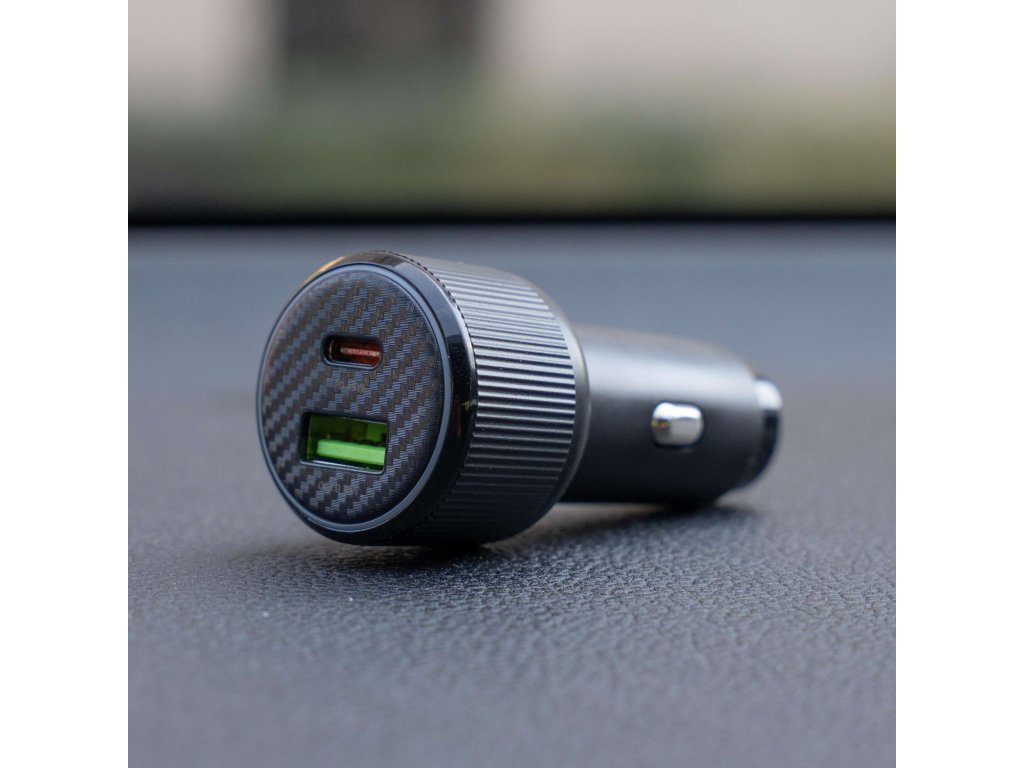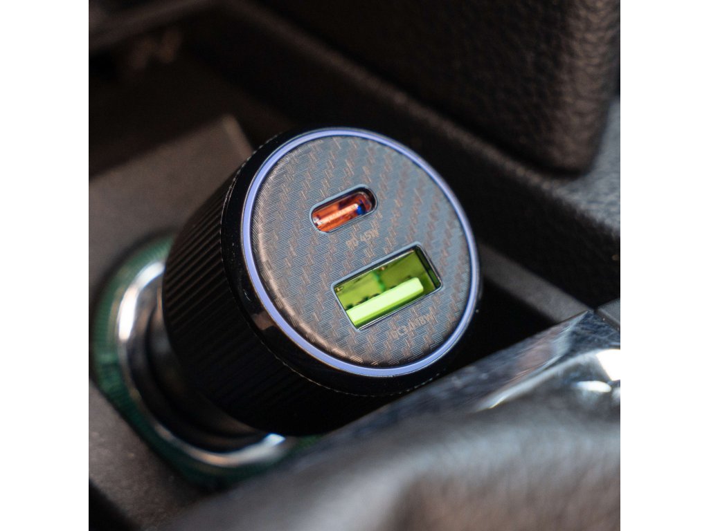Výkonná autonabíječka s podporou PD 3.0 a QC 3.0, ideální pro nabíjení notebooků, tabletů i smartphonů. Součástí balení je USB-C/USB-C kabel (1 m, 60 W, 3A, soft silicone). Modrý LED prstenec usnadní připojení kabelu i při jízdě v noci.