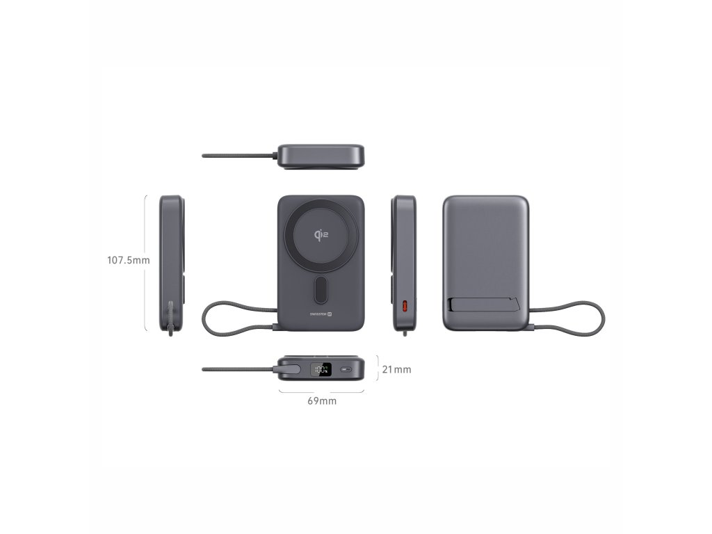 SWISSTEN Powerbanka MagSafe Qi2 15 W, 10000 mAh s integrovaným kabelem USB-C, černá