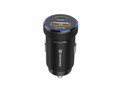 Autonabíječka Swissten 20W, Porty: USB-C + USB-A, Max. výkon USB-C: 20W, Max. výkon USB-A: 18W, Váha: 25 g, Rozměry: Průměr 2,43 × 4,93 cm. Baleno v blistru Swissten.