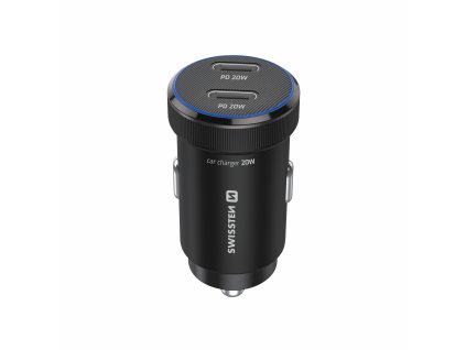 Autonabíječka Swissten 20W, Porty: 2× USB-C, Max. výkon USB-C1: 20W, Max. výkon USB-C2: 20W, Modré LED světlo, Váha: 26 g, Rozměry: Průměr 2,43 × 4,93 cm. Baleno v blistru...