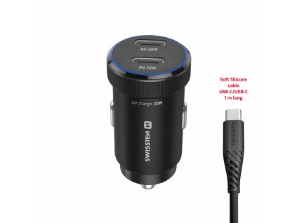 Autonabíječka Swissten 20W s kabelem, Porty: 2× USB-C, Max. výkon USB-C1: 20W, Max. výkon USB-C2: 20W, Kabel: USB-C/USB-C 1m 60W, Modré LED světlo, Váha: 26 g, Rozměry: Průměr...