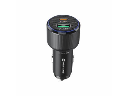 Autonabíječka Swissten 63W, Porty: USB-C + USB-A, Max. výkon USB-C: 45W, Max. výkon USB-A: 18W, Modré LED světlo, Váha: 28 g, Rozměry: Průměr 3,25 × 7,39 cm. Baleno v blistru...